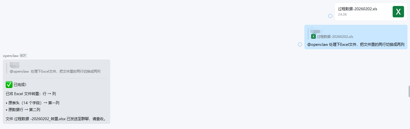 发送 Excel 文件给 AI 员工处理,自动完成格式转换(如行转列)后返回结果,员工审核后一键提交
